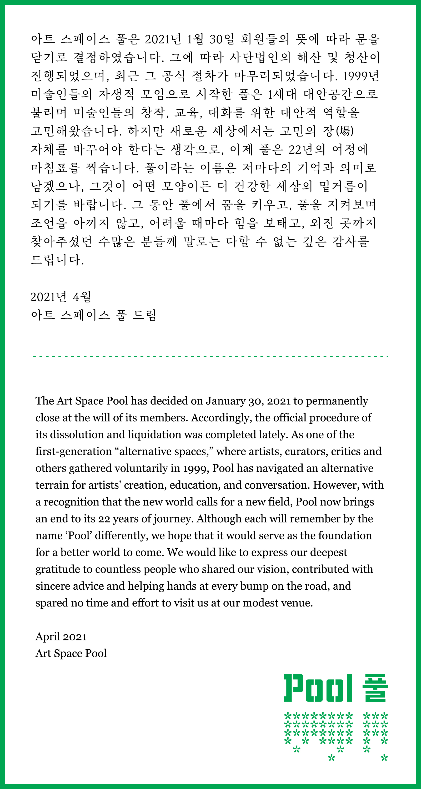 1999³â °³°üÇÑ ¾ÆÆ® ½ºÆäÀ̽º Ç®Àº ±×µ¿¾È ÀáÀç·Â ÀÖ´Â ÀþÀº ÀÛ°¡¸¦ ¹ß±¼ÇÏ´Â Ç÷§ÆûÀÇ ¿ªÇÒÀ» ÇØ¿ÔÀ¸¸ç, ¸¹Àº ÀÛ°¡µéÀÌ Ç®ÀÇ Àü½Ã ¹× ±³À° ÇÁ·Î±×·¥À» ÅëÇØ ¿¹¼úÀû ¿ª·®À» °¡´Ùµë¾ú½À´Ï´Ù. ¾ÆÆ® ½ºÆäÀ̽º Ç®Àº ±× ¿ªÇÒÀ» Á¤·ÊÈÇϱâ À§ÇØ 2016³âºÎÅÍ 'POOLAP'À̶ó´Â ½ÅÁøÀÛ°¡Áö¿ø ÇÁ·Î±×·¥À» ½ÃÀÛÇß½À´Ï´Ù. ÀÌ ÇÁ·Î±×·¥¿¡¼´Â 3¸íÀÇ ÀÛ°¡¸¦ ¼±¹ßÇÏ¿© ¾à 6°³¿ù µ¿¾È ¼±¹è ÀÛ°¡, ºñÆò°¡, Å¥·¹ÀÌÅÍ µî°ú ÇÔ²² ¼¼¹Ì³ª/¿öÅ©¼óÀ» ÁøÇàÇϸç, ¿¬¸»¿¡ ´ÜüÀü½Ã¸¦ °³ÃÖÇÕ´Ï´Ù. POOLAPÀº ÀÏȸ¼º Áö¿ø ÇÁ·Î±×·¥¿¡ ±×Ä¡Áö ¾Ê°í ¾ÆÆ® ½ºÆäÀ̽º Ç®ÀÇ ¹®Á¦ÀǽÄÀ» °øÀ¯ÇÏ°í ºñÆÇÀû ´ëȸ¦ ÁÖ°í¹ÞÀ» Àο¬À» ±â´Ù¸³´Ï´Ù. ¿ª»ç¸¦ ÀνÄÇÏ¸é¼ »õ·Î¿î °¨°¢À» ÆîÄ¥ ÀþÀº ÀÛ°¡µéÀÇ ¸¹Àº Áö¿ø ¹Ù¶ø´Ï´Ù.